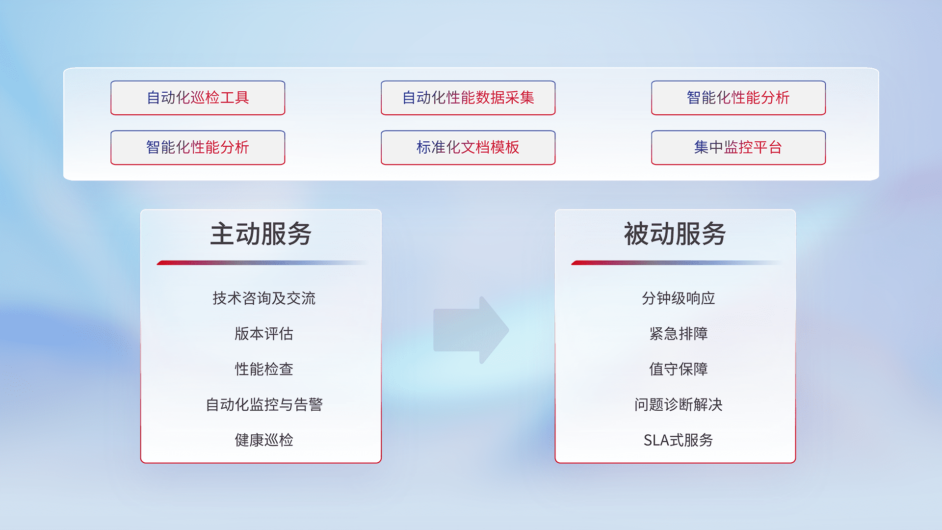 智能化工具和标准化文档,,保障服务质量,,,提供主动服务(包含技术咨询、、、版本评估、、、、性能检查、、、、自动化监控与告警、、、健康巡检)和被动服务包含(分钟级响应、、紧急排障、、、、值守保障、、问题诊断解决、、SLA服务)。。