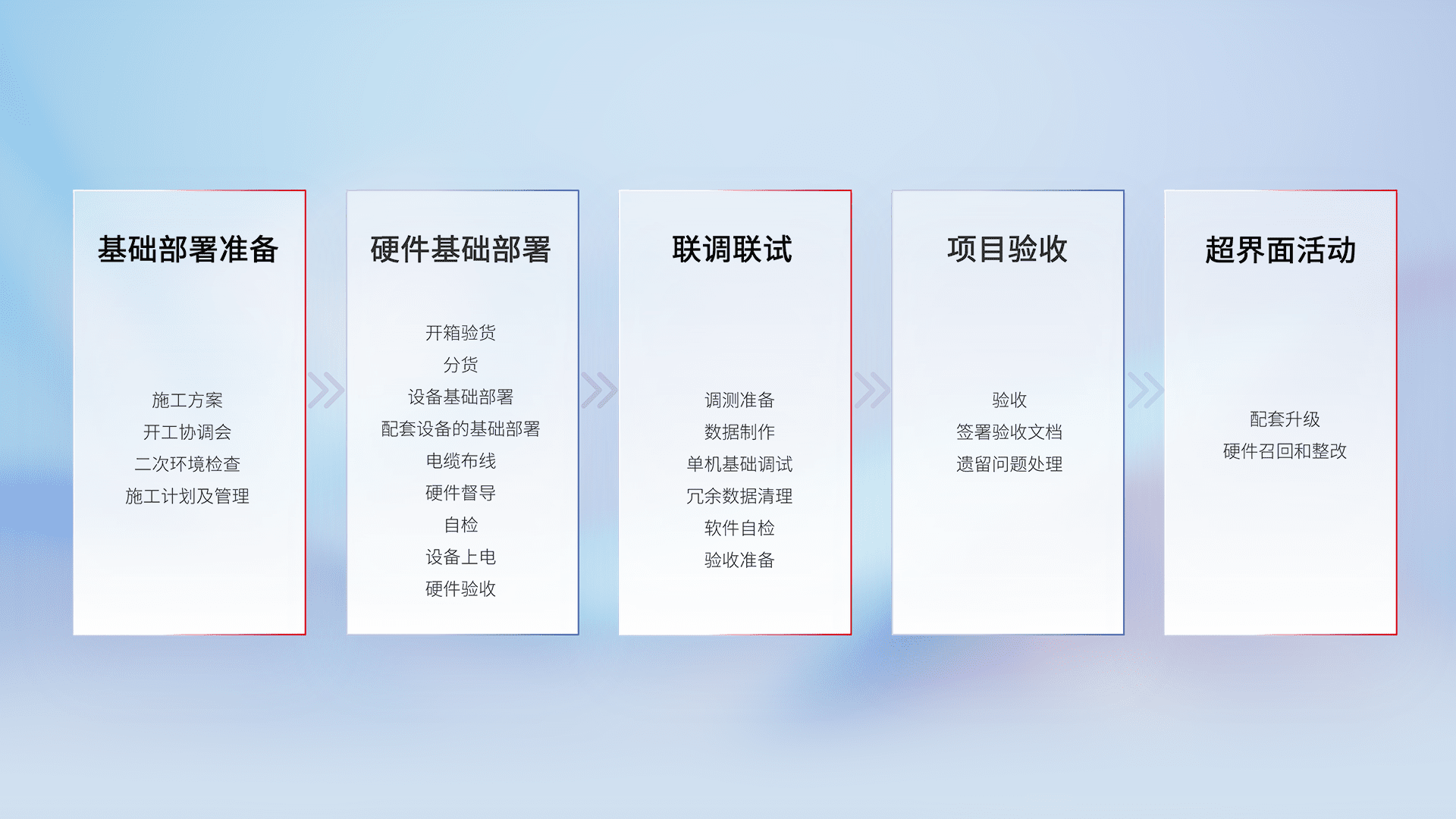从基础部署准备、、、硬件基础部署、、、联调联试、、、、项目验收、、、越界面活动的全过程可追溯,,,,保证施工质量和进度。。。。